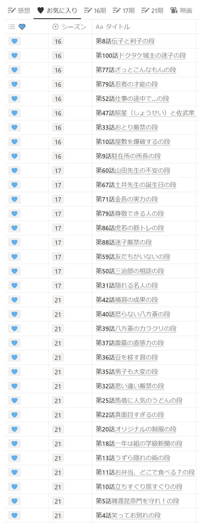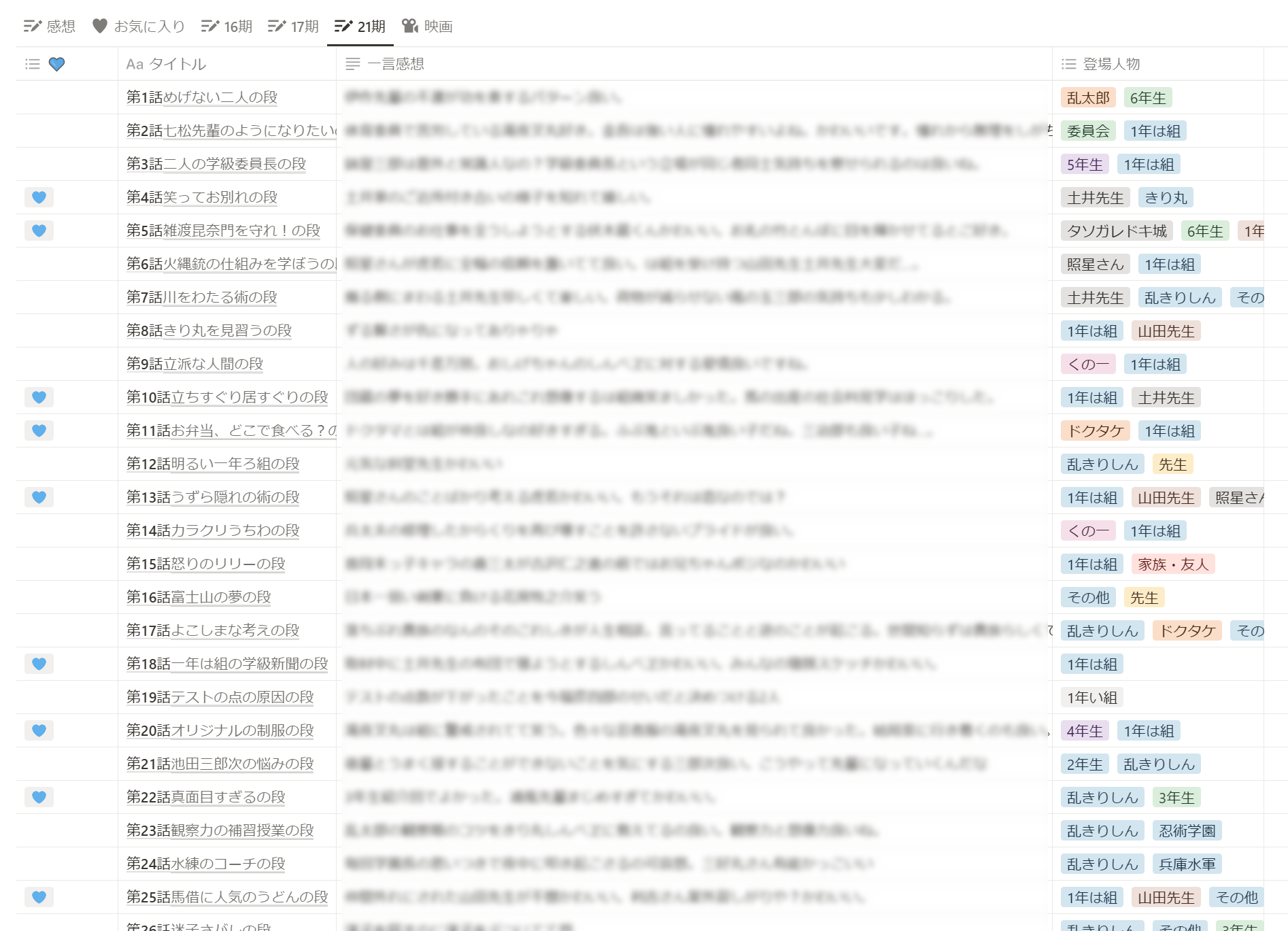 忍たま少しずつ見てるよん🍳今21期の途中です🎠 忘れっぽいのでこんな感じで雑にメモってて抜けはあると思うけどお気に入りのお話はこちらです。 傾向としてはドクタマとにんたまがわちゃわちゃしてるお話、山田親子、ドクタケ親子、優秀な子が巻き込まれて苦労してるお話、師弟や大人と子どもの組み合わせが好きです🍄 山田親子と土井先生のお話を欲してるので引き続き見てくよ~☕ よろしくどうぞ🙇♂️ メモ 2025/01/21(Tue) 21:45:23 favorite