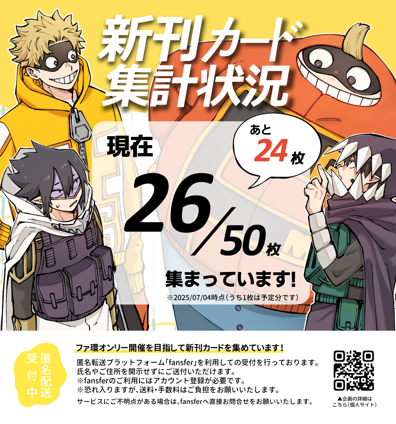 新刊カードを集めるのは初めてだったため、友人に相談していたところ、1枚余っているカードを譲っていただけることになり、集計経過の画像は26枚で制作しました。